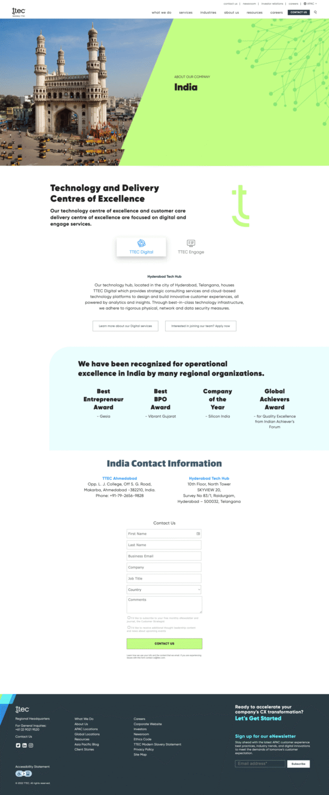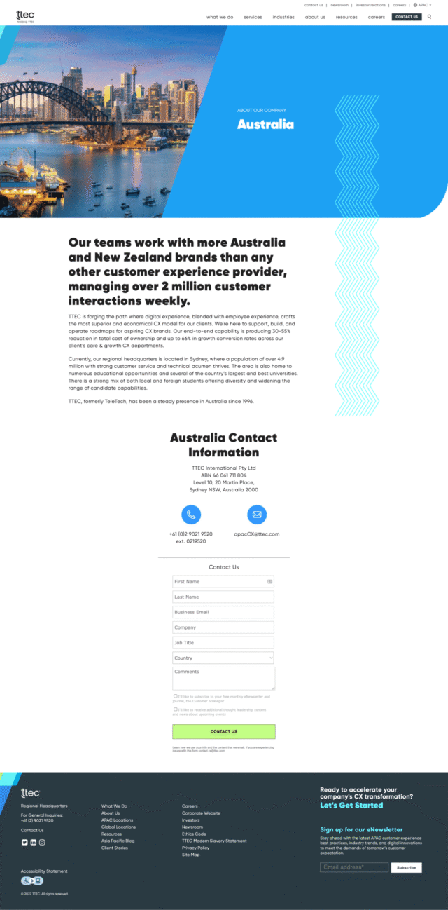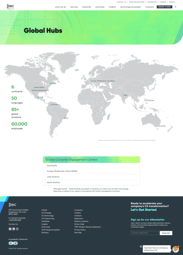 In my time at TTEC we wanted to present landing pages that showed where some of our contact centers were around the world. For some of these sites it included a developed page for that specific location while others were focused on a global hub page.